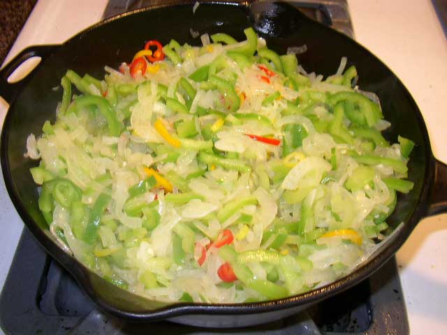 The first step of my Shakshukah Next → The first step, onion, garlic and all sorts of peppers frying happily in my skillet