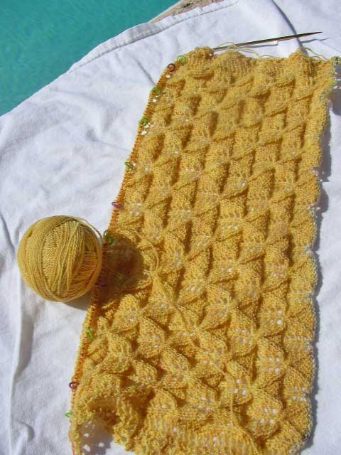 Honey Bee Stole in the making ← Previous This stole is a real pleasure to knit, I am using Wooly Wonka Fibers merino laceweight yarn and Anne Hanson’s pattern.